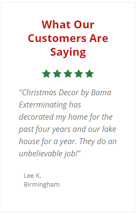 In an effort to give our customers the highest quality of service possible, we always provide open and honest communication, utilize the safest methods, and undergo extensive training. With years of experience under our belts, we’ve had time to develop our techniques so we can set up and take down your holiday decor as efficiently as possible. When you partner with the Christmas Decor by Bama Exterminating team for your Christmas lighting and decoration needs, you can rest assured that we’ll get the job done right the first time!